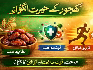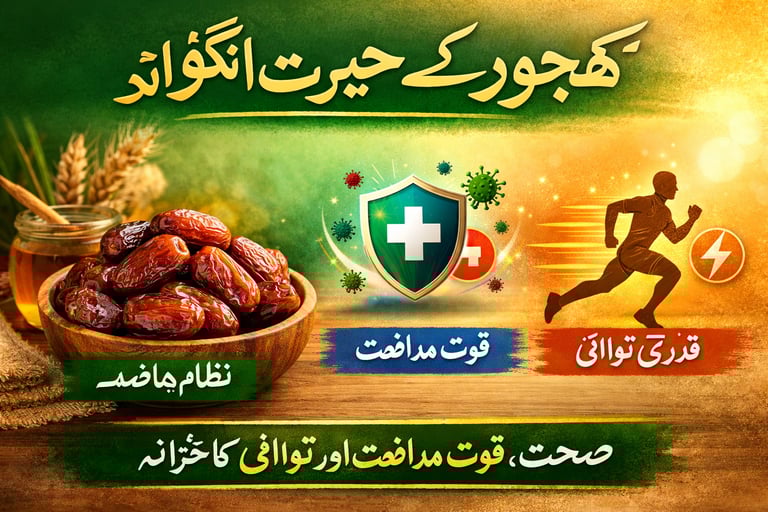 کھجور صرف ایک میوہ نہیں بلکہ صحت کا خزانہ ہے۔ یہ نظامِ ہاضمہ کو درست رکھنے، قوتِ مدافعت کو مضبوط بنانے اور جسم کو قدرتی توانائی فراہم کرنے میں اہم کردار ادا کرتی ہے۔ اگر آپ صحت مند اور توانا زندگی چاہتے ہیں تو کھجور کو اپنی روزمرہ غذا کا حصہ ضرور بنائیں۔